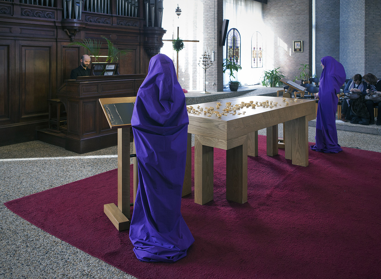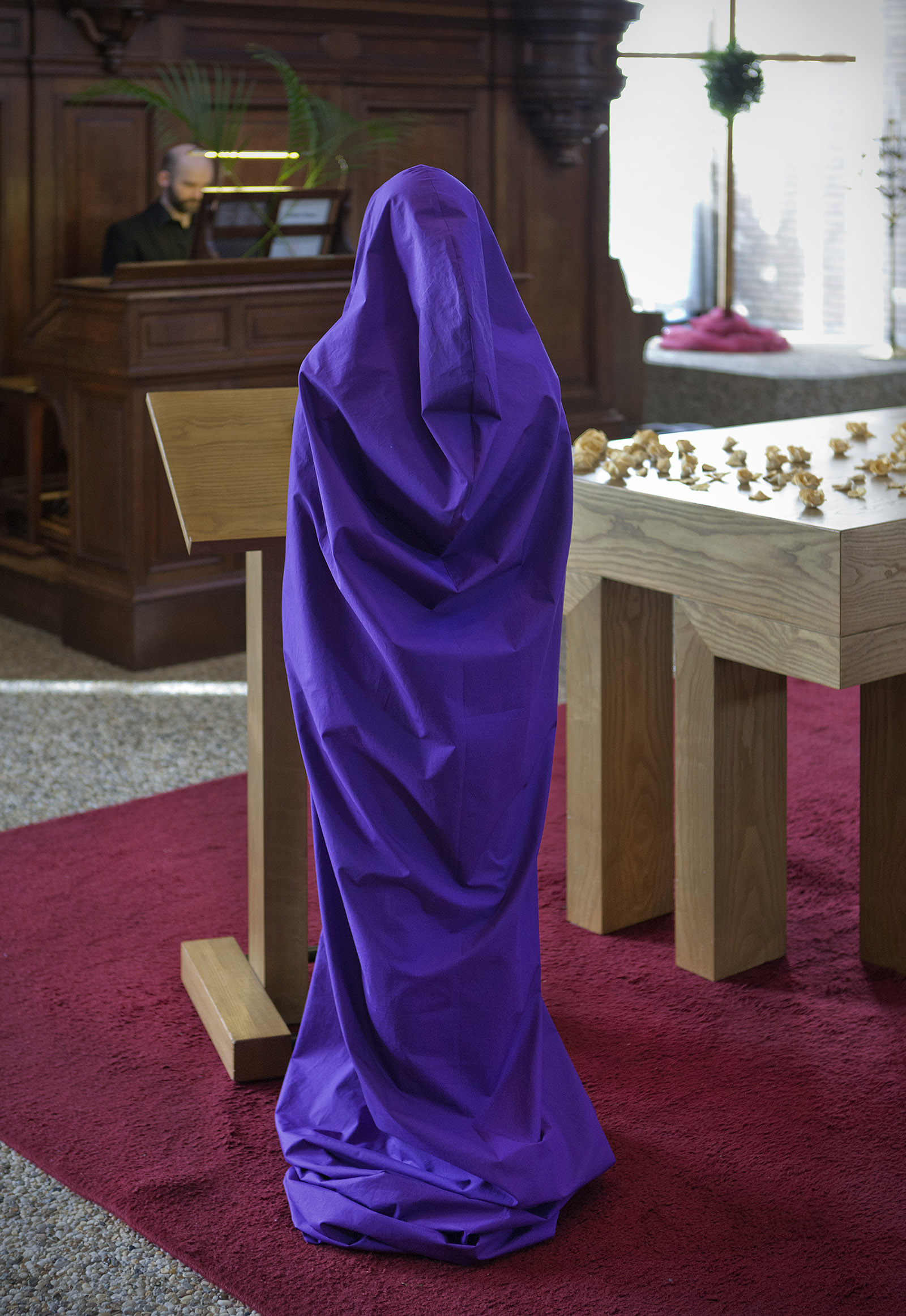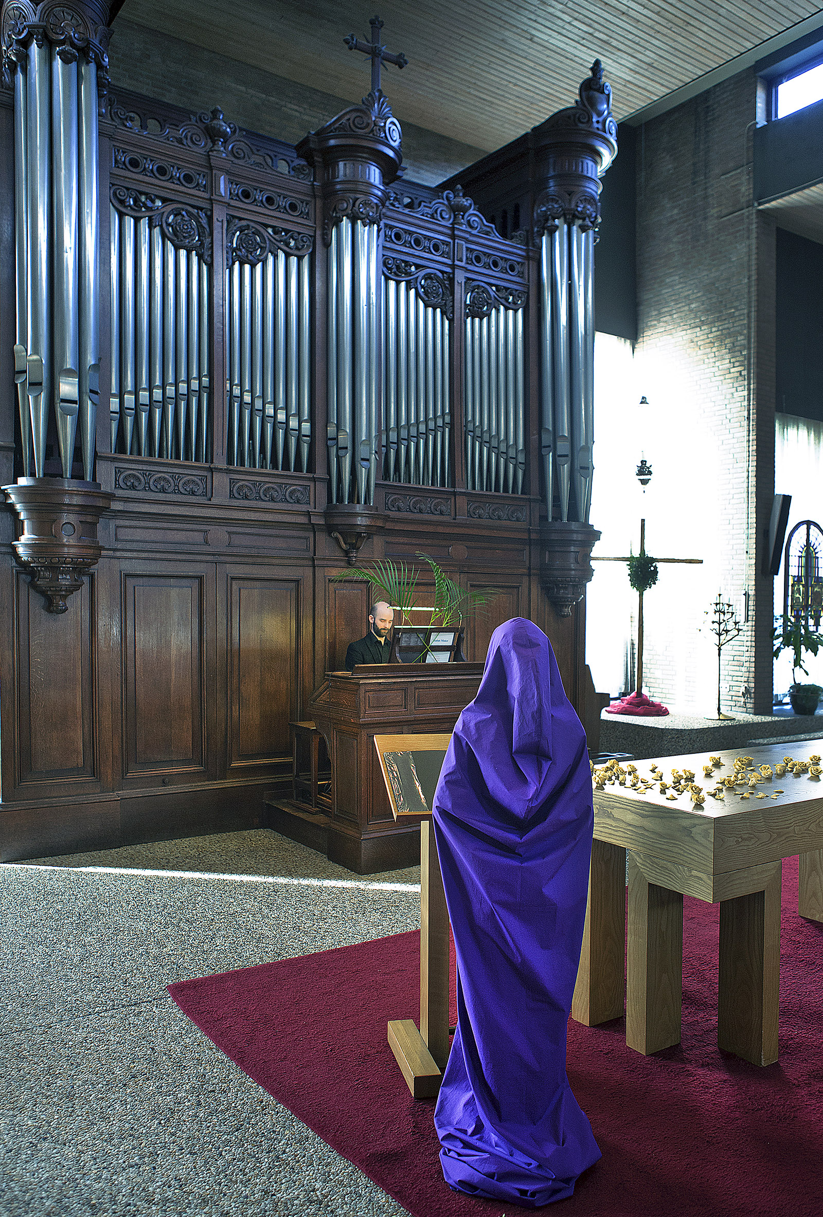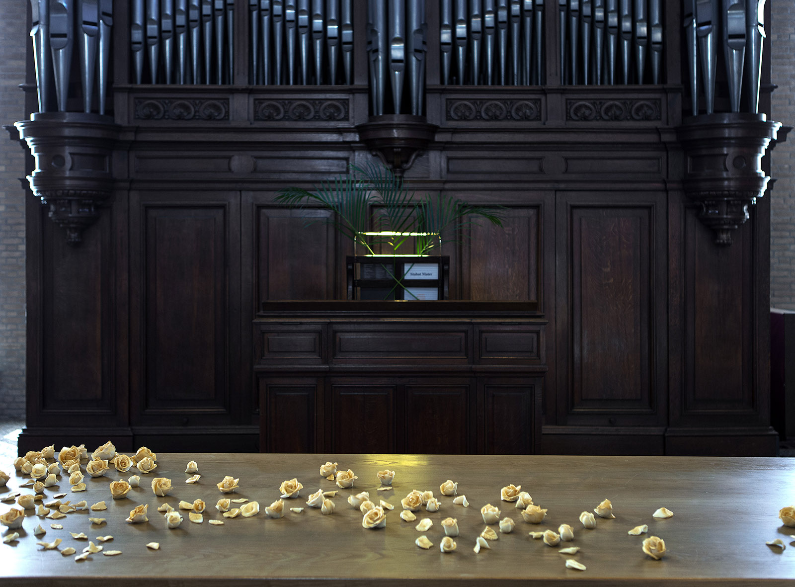 The different visual elements which are part of this project refer to the Easter Sundays. The golden marzipan roses on the altar refer to Laetare Sunday, when the pope blesses the golden rose. The two performers covered in purple cloth (costumes made by Niki Mens) refer to Passion Sunday, when statues and crosses in churches are covered with purple fabrics. The palm leaves on the organ refer to Palm Sunday, the day when processions of worshipers carrying palms are held.