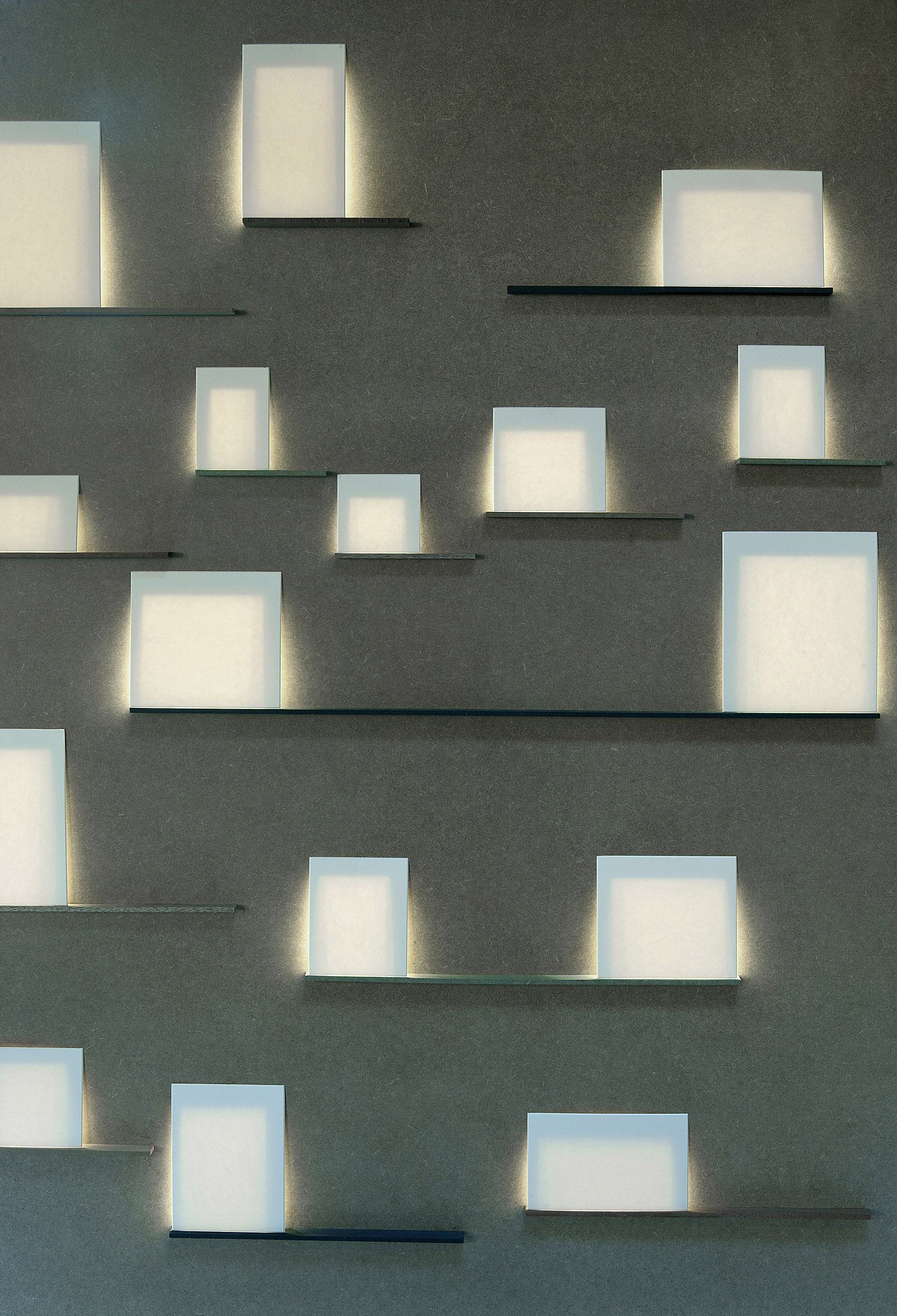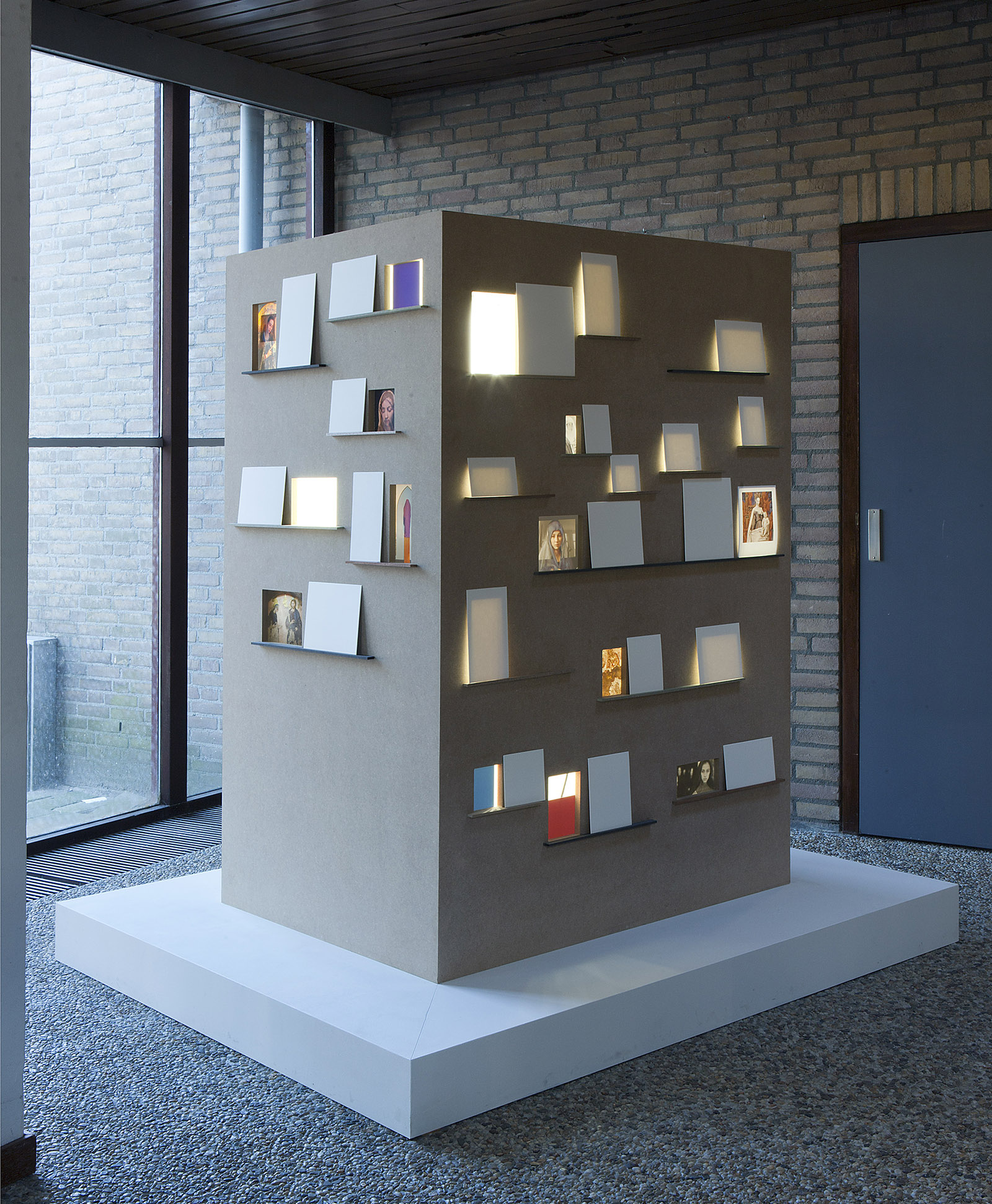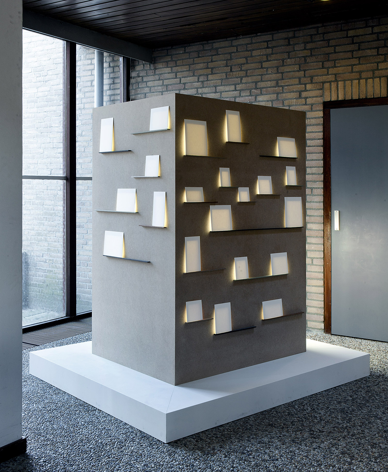 The installation is made with mdf, wood, paint, tube lights, cardboard, inkjet prints and paper