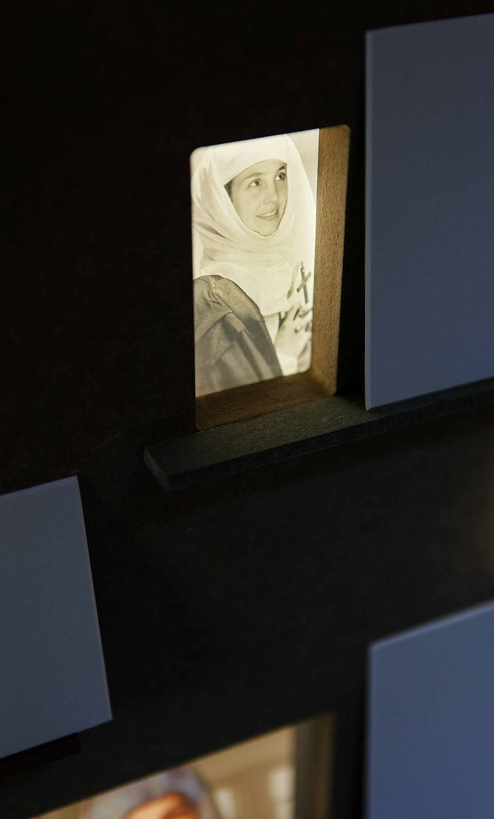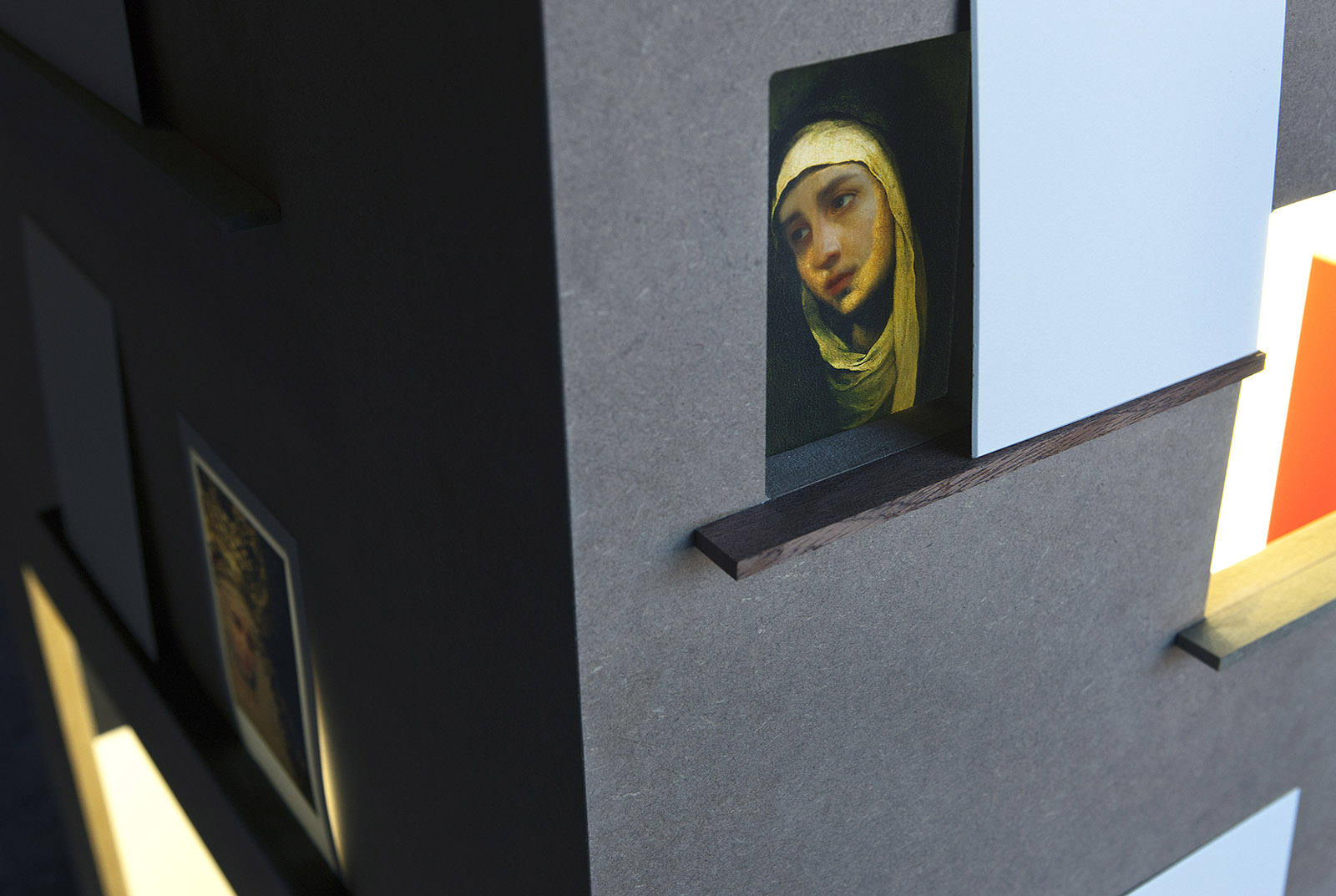 During the 40 days of Lent, Kraal opened a window every day, counting the days until Jesus' death. Every self-portrait in the installation refers to Maria.