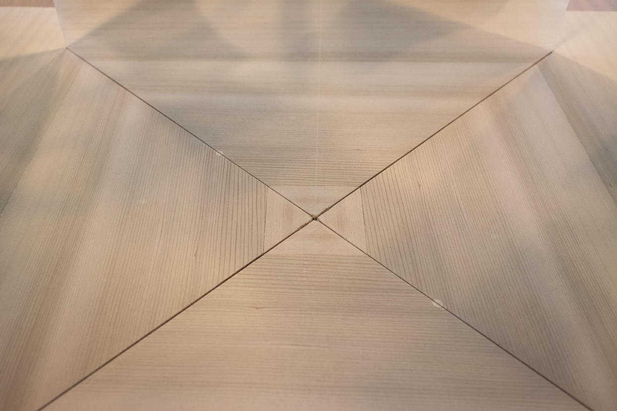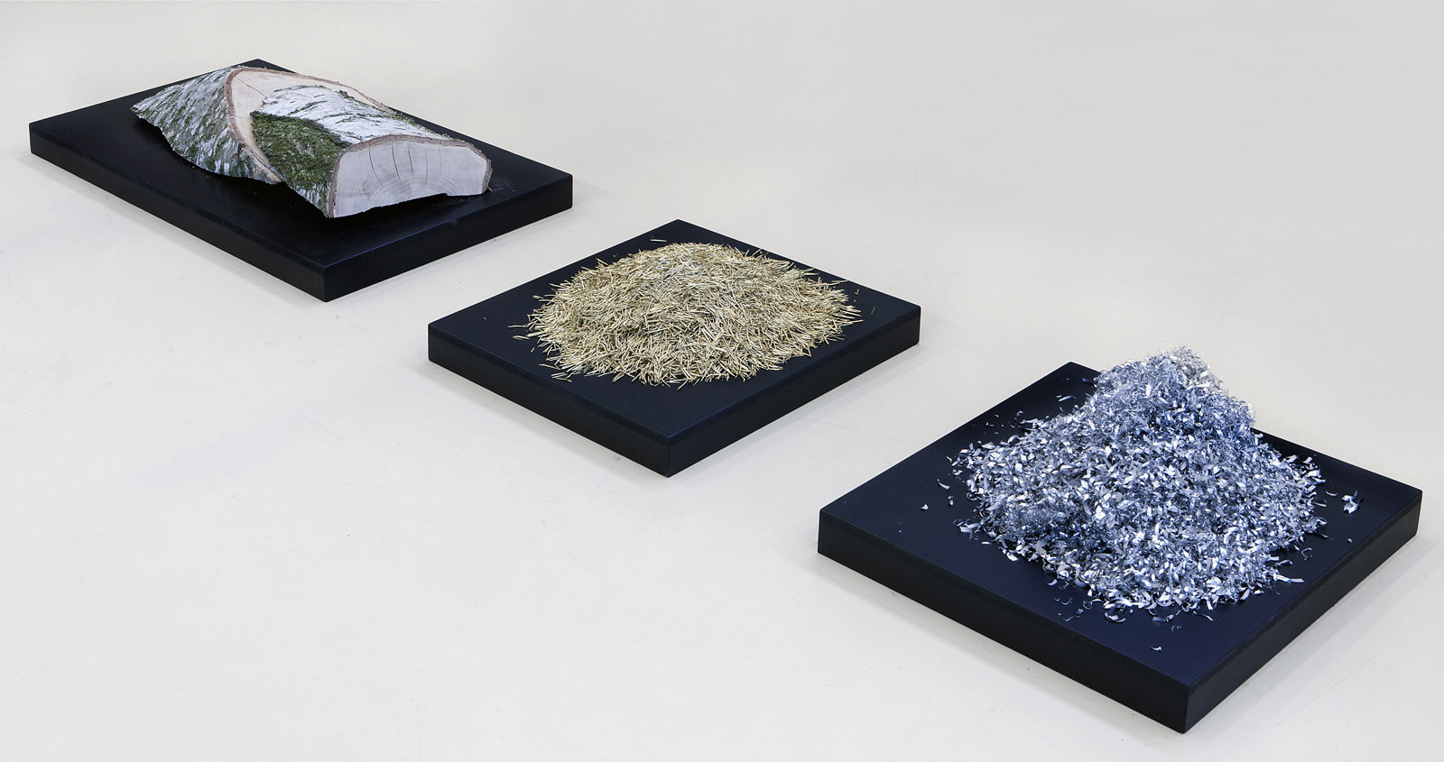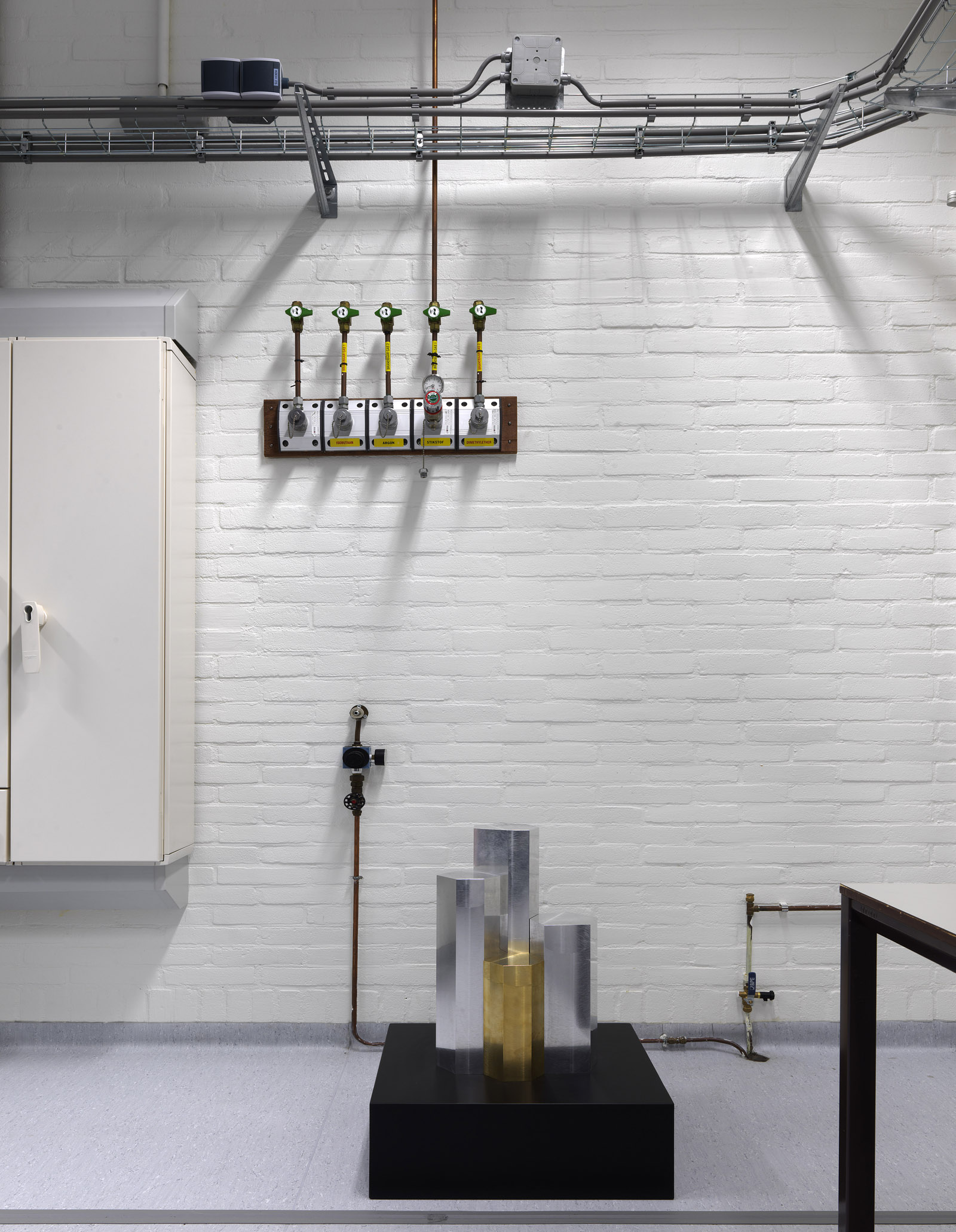 8. Laboratory, Van der Waals-Zeeman Institute for experimental physics, low pedestals with tree trunks, gold (brass) and silver (aluminium) residue (by Doina Kraal)