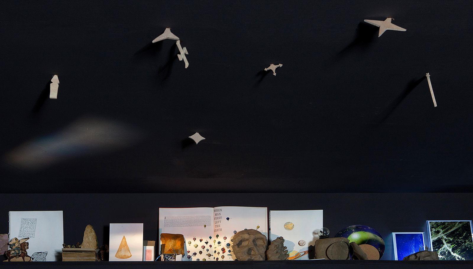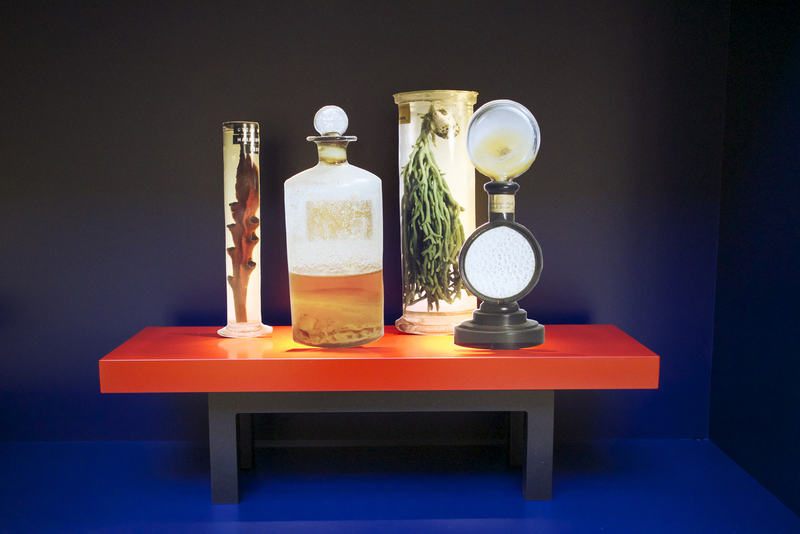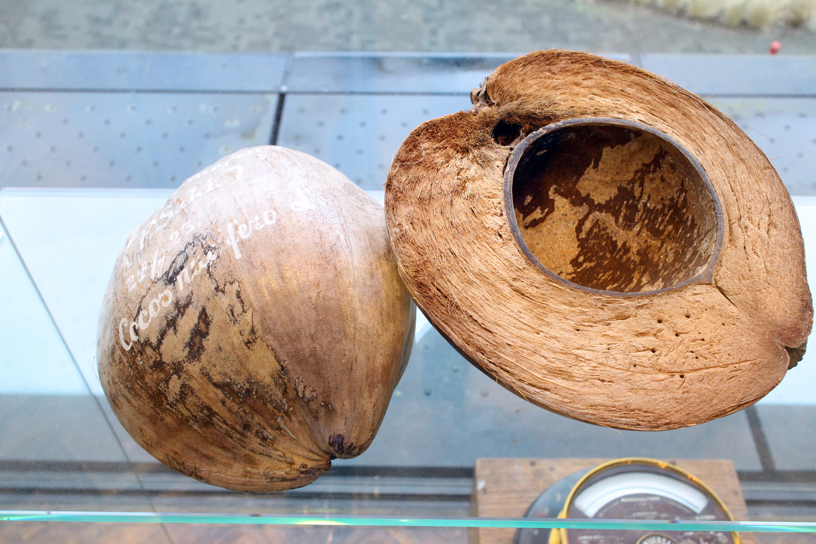 The exhibition continues for a longer walk all the way passing stairs on the left (down below which a large part of the New Realism show can be seen) into the next corridor where there are more vitrines on the right-hand side). Hidden amongst these objects are my numbers 6 and 7. I have placed several objects that question how we name things, how we categorise them. Once we named something we can never again see it the same way. Many of these objects could as well – especially nowadays – be found in a museum for contemporary art. They serve an educational purpose, but also a highly aesthetic one. They can be questioned, they can be used, they can be examined, the can be enjoyed.